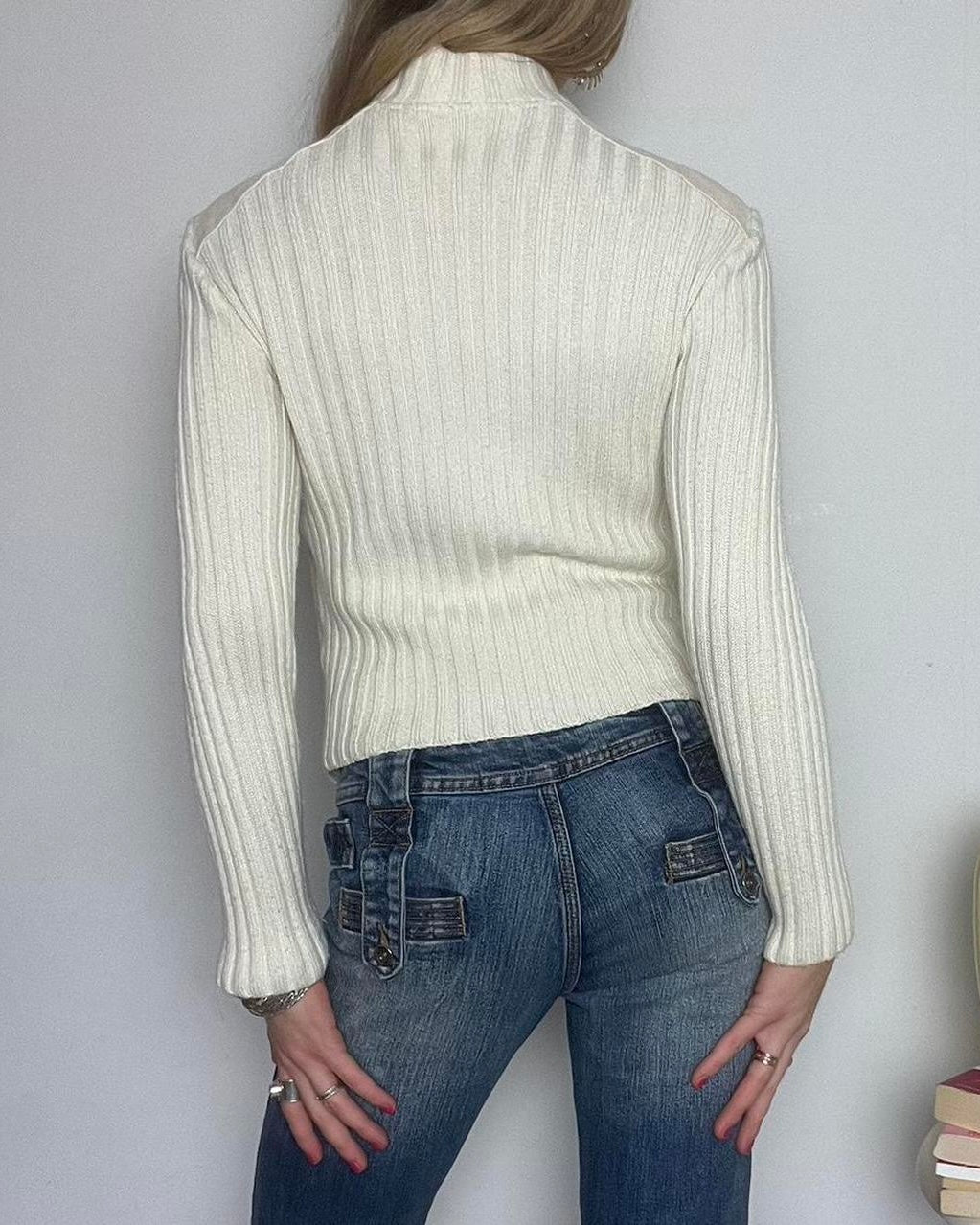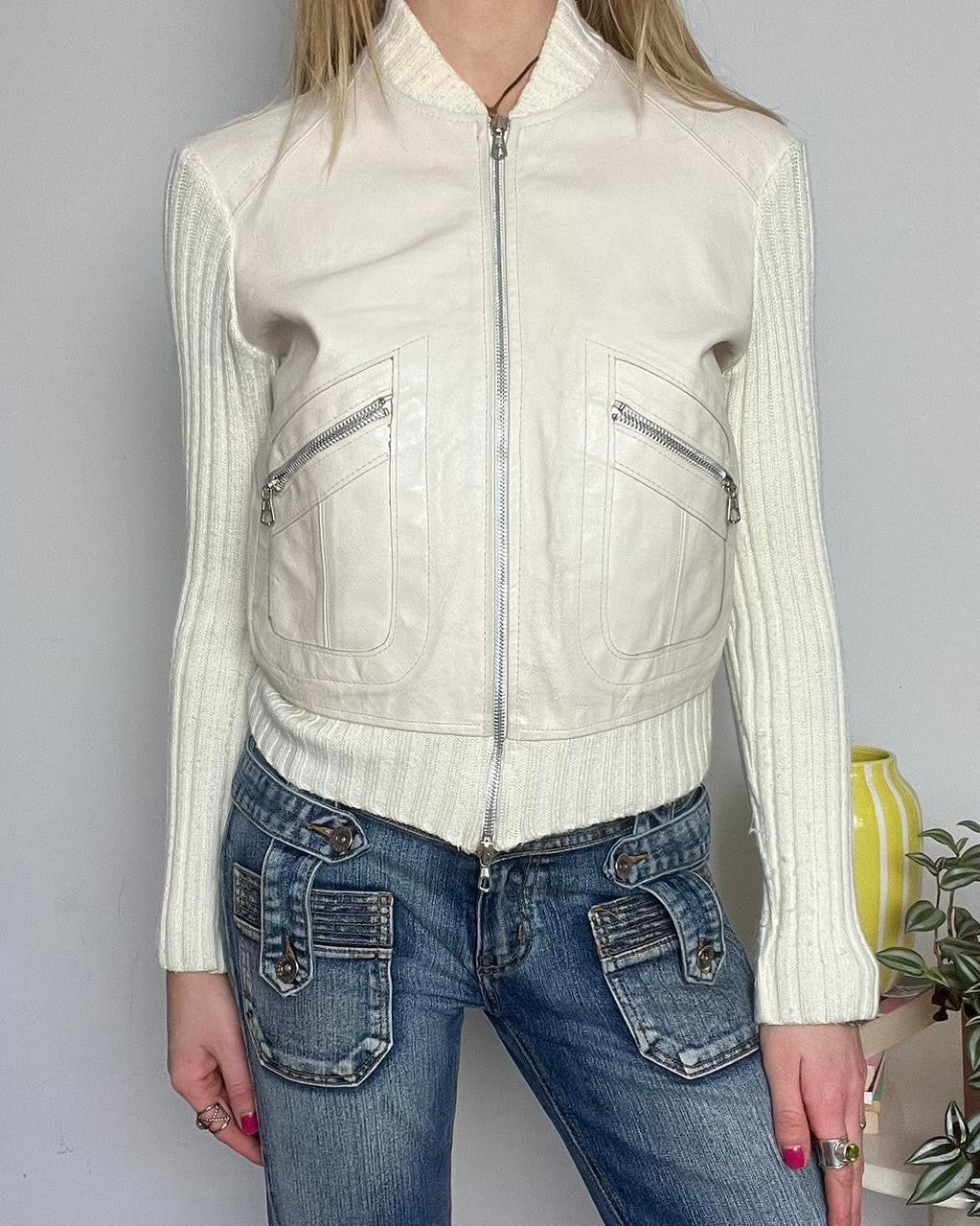 cream vintage 00s zip up genuine leather jacket with knit ribbed sleeves