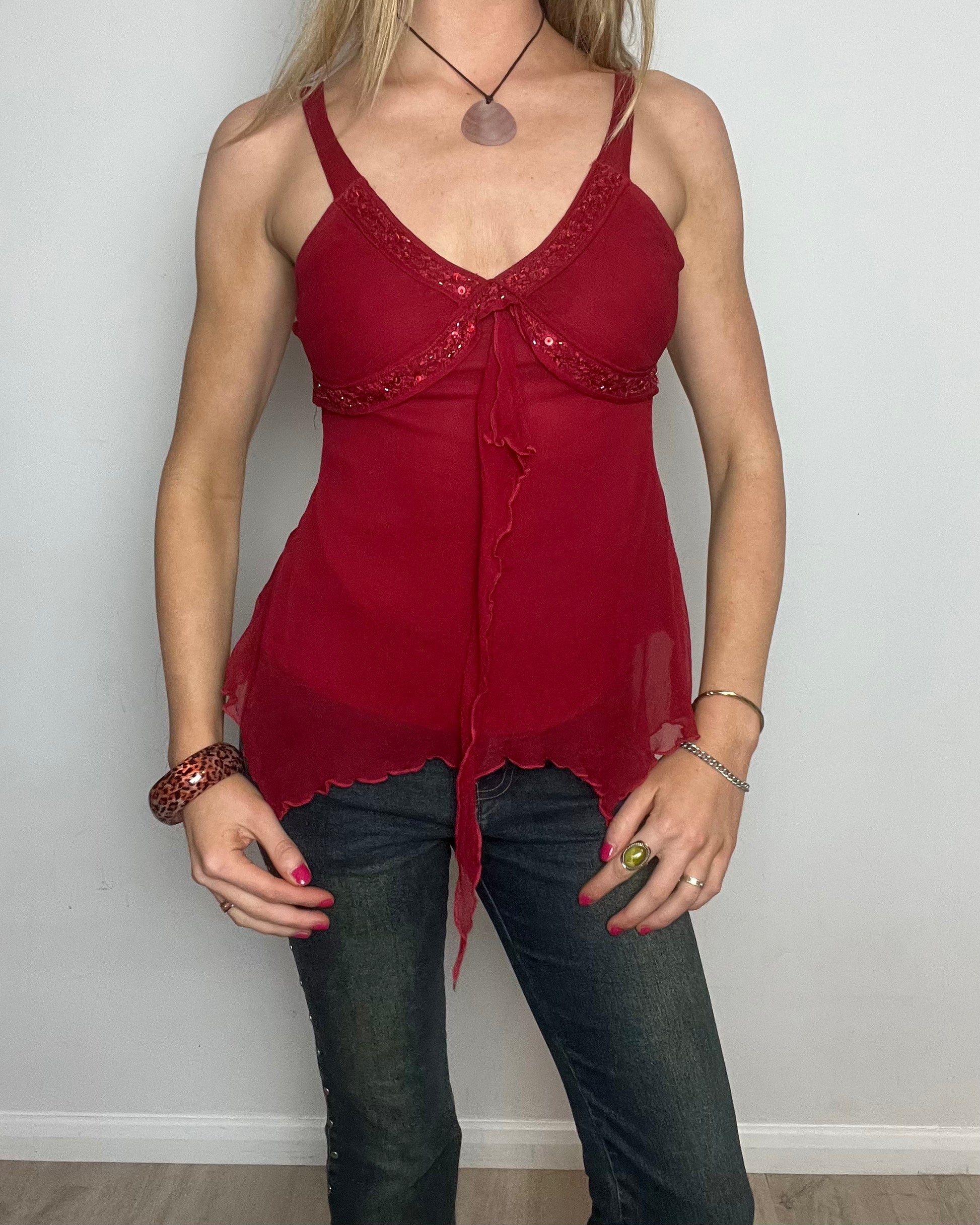 vintage 00s 'motivi' red sequin ruffle cami top